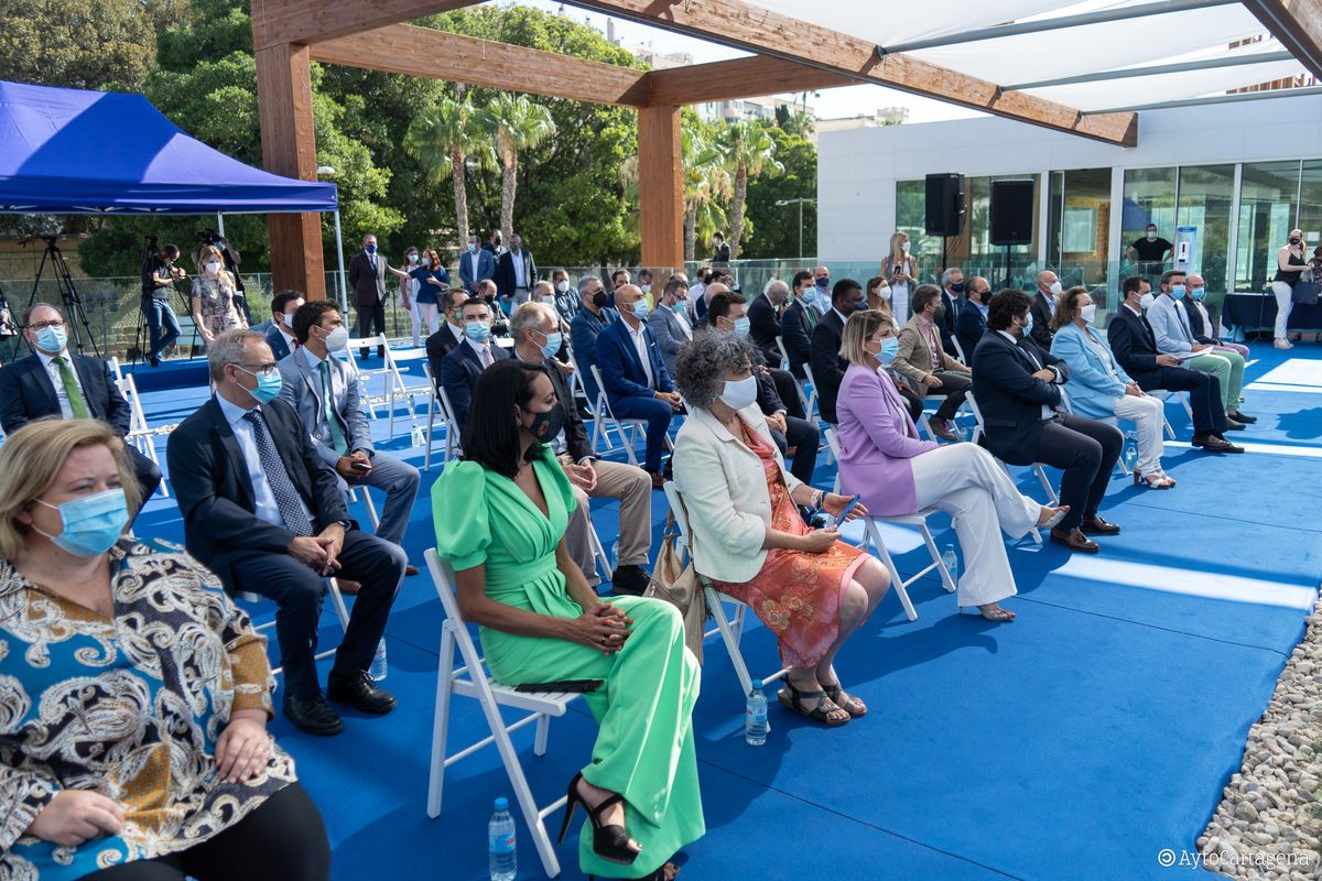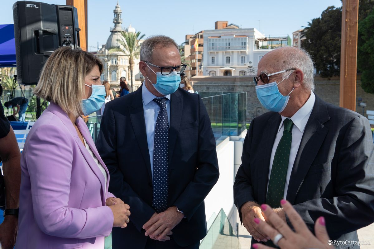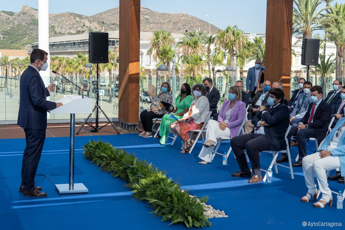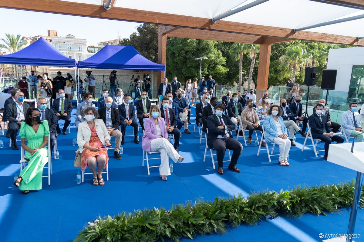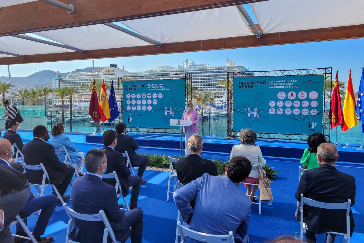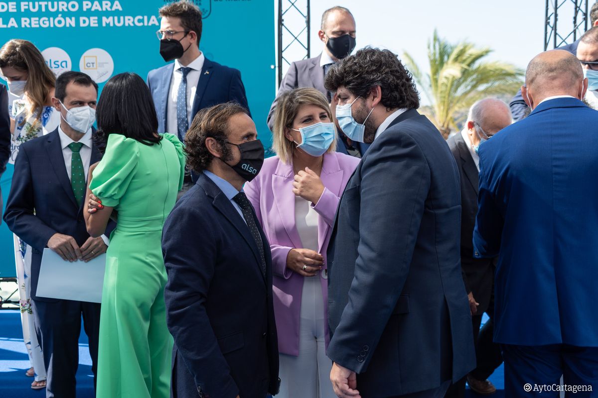 La alcaldesa de Cartagena, Noelia Arroyo, acompañada del presidente de la Comunidad, Fernando López Miras, ha dado la bienvenida a Cartagena durante el acto de presentación de la Plataforma del Valle del Hidrógeno Verde de la Región de Murcia, que aúna a 34 entidades públicas y privadas para desarrollar de forma coordinada esta energía limpia en el territorio regional, especialmente en el Valle de Escombreras, así como para atraer inversiones y trabajar en la obtención de fondos de recuperación de la Unión Europea.