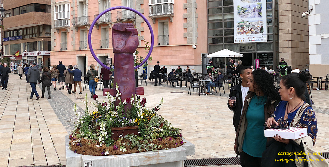 La concejalía de Parques y Jardines del Ayuntamiento de Cartagena, que dirige el edil Juan Pedro Torralba, sigue creando adornos florales en la ciudad según fechas señaladas. En febrero fue por San Valentín y ahora ha creado este diseño del símbolo feminismo entre las plazas del Ayuntamiento y de Héroes de Cavite con motivo del 'Día internacional de la mujer', que tiene lugar el 8 de marzo.