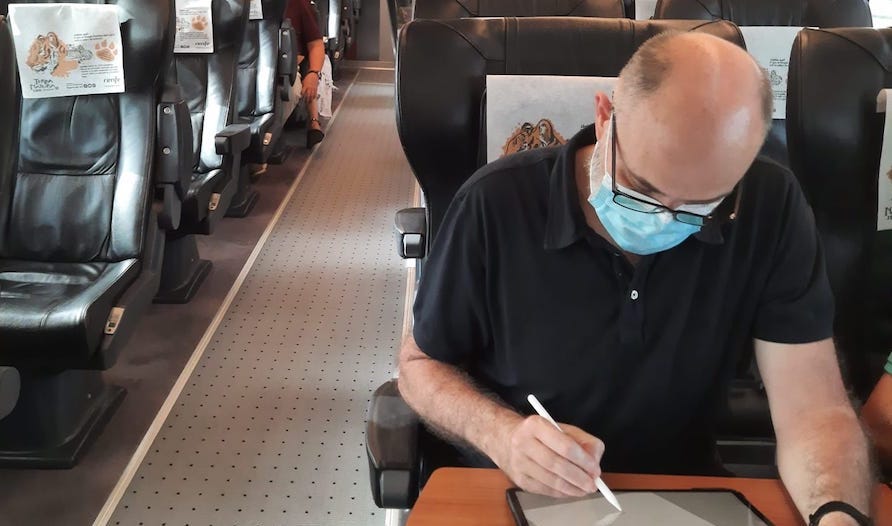 El libro que se editó hace 13 años contó con la coordinación del histórico dibujante José Antonio Fernández, Fer; y el prólogo del periodista Josep M. Cadena. A propósito del viaje, Cadena escribió a modo de resumen de la iniciativa: “El tren -el AVE en especial- descansa el viajero, le da seguridad y le incita a ser solidario con los demás. Y si se tiene suerte -como a mí me ha ocurrido- de desplazarse arropado por los humoristas gráficos más incisivos del país, la vida colectiva gana color y en formas. Porque en ellos hay inteligencia activa, palabras con nuevos sentidos, rápidos, precisos que se concentran en caricaturas de personas y hechos más reales que los engaños y espejismos de la vida misma”.