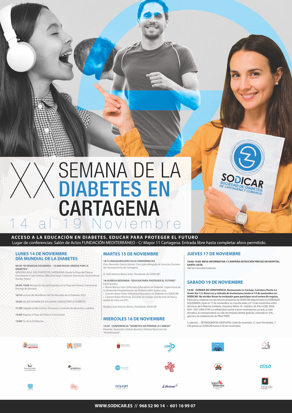 Conferencias impartidas por expertos y profesionales sanitarios, una marcha solidaria, mesas informativas en el Hospital Santa Lucía, retinografías, la lectura del manifiesto y una comida de convivencia son las actividades que se van a desarrollar del 14 al 19 de noviembre por el Día Mundial de la Diabetes, el 14 de noviembre. Organizado por la Sociedad de Diabetes de Cartagena y Comarca, SODICAR, con la colaboración del Ayuntamiento de Cartagena.