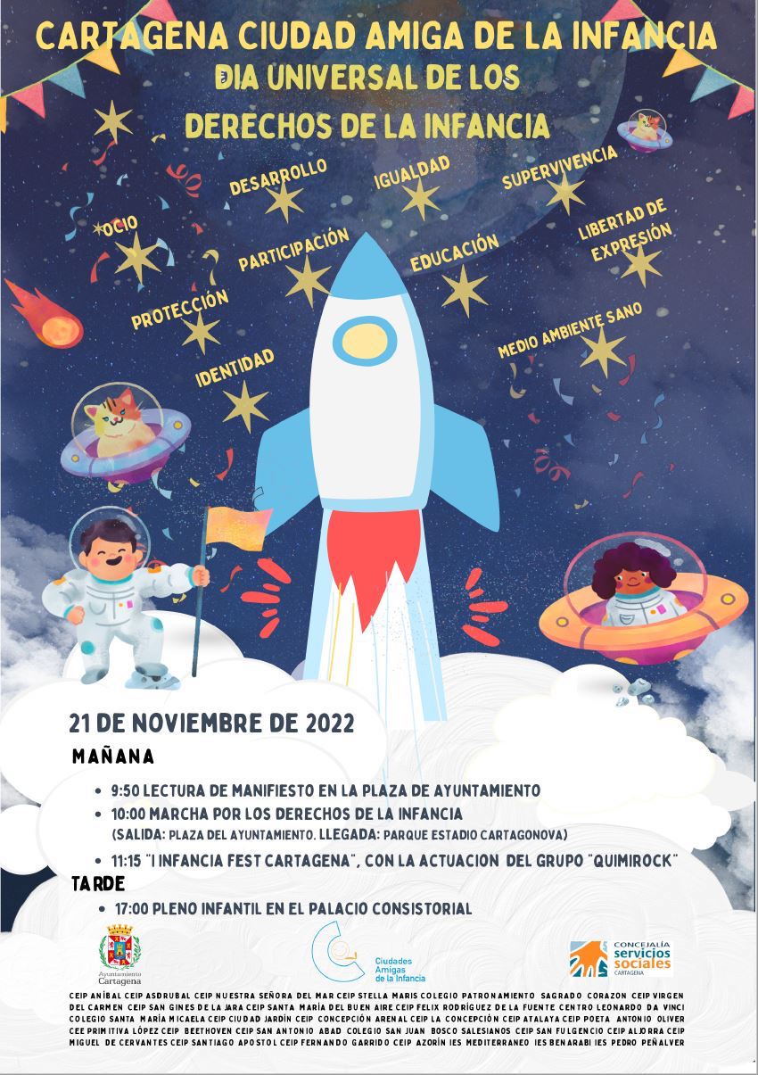 La jornada programada por la concejalía de Servicios Sociales comenzará con la lectura de manifiesto y continuará con una marcha entre la plaza del Ayuntamiento y el Cartagonova, para después disfrutar de la 'I Infancia Fest Cartagena', en la que actuará 'Quimirock'. Por la tarde, pleno infantil en el Palacio Consistorial.