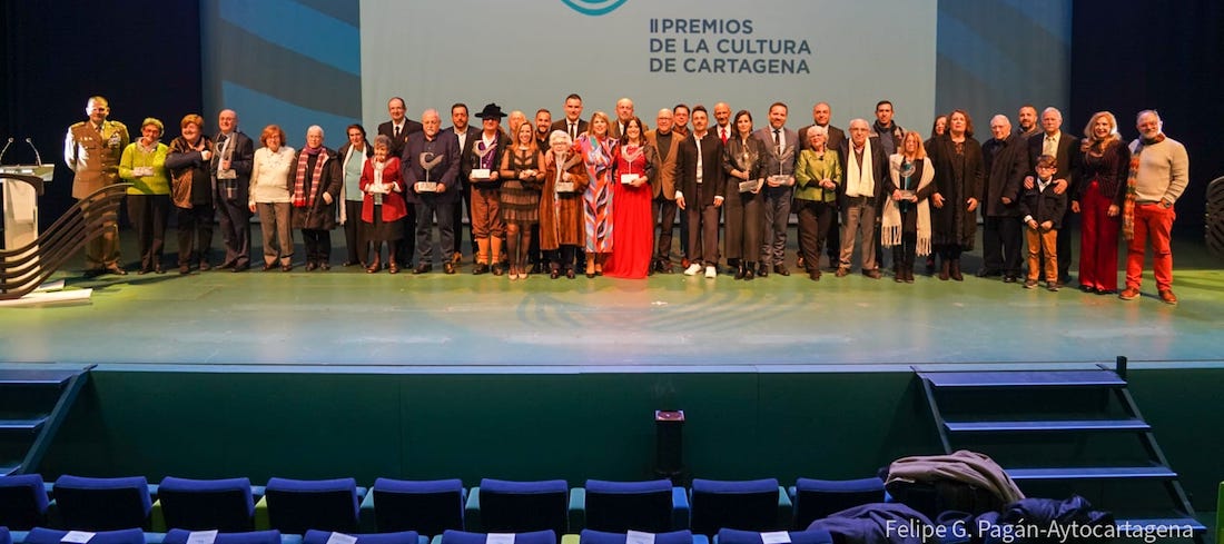 María Teresa Cervantes, Jaime Cros, Grupo Folclórico Ciudad de Cartagena, Juan Manuel Díaz Burgos, Silvia Conesa, Coral Tomás Luis de Victoria, Plataforma Ciudadana Virgen de la Caridad, Comunidad Hermanitas de la Asunción, Colectivo de Educación de Personas Adultas Carmen Conde y Conservatorio de Cartagena fueron los destinatarios de los galardones de la 'II Gala de los premios de la cultura', que organizó anoche el Ayuntamiento en El Batel.