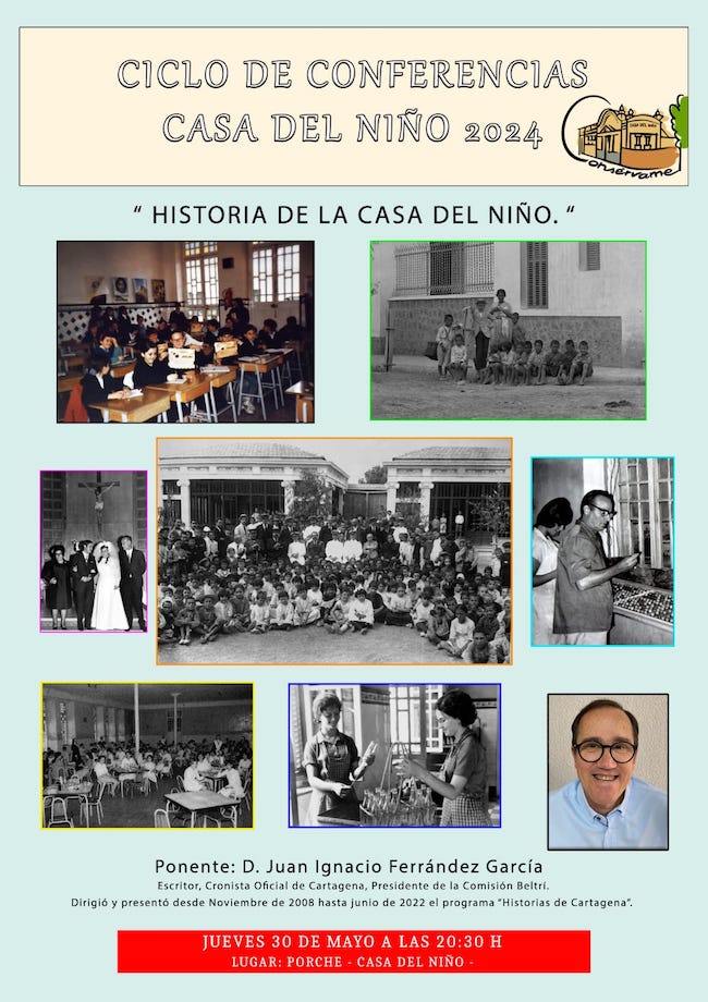 Pedro Luis Moreno Martínez ofreció una conferencia en la que expuso el origen de la querida institución cartagenera desde que se implantó la ‘Ley de protección a la infancia’ en España, que fue el inicio del camino hacia su creación y al estreno del edificio en 1918, además de rescatar personas importantes en ese proceso como el doctor Tolosa Latour y Félix Martí Alpera, entre otros. Este jueves llega una nueva conferencia, siendo el ponente Juan Ignacio Ferrández García, integrante del equipo de cronistas oficiales de Cartagena.