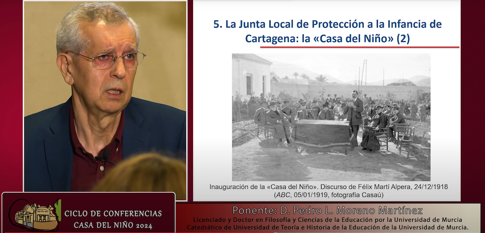 Pedro L. Moreno es licenciado y doctor en Filosofía y Ciencias de la Educación y catedrático de Universidad de Teoría e Historia de la Educación, en ambos casos por la Universidad de Murcia. Dentro del ciclo cultural que se está desarrollando de la más que centenaria institución, ofreció la conferencia ‘La Casa del Niño - Un plan ambicioso e innovador de protección a la infancia de Cartagena: 1908-1936’.