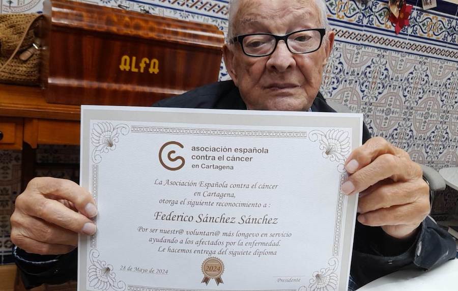 La Asociación Española Contra el Cáncer (AECC) de Cartagena ha distinguido a Federico Sánchez con el nombramiento de “voluntario más longevo” en el servicio de ayuda a los afectados por esta enfermedad.