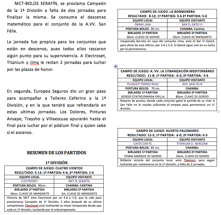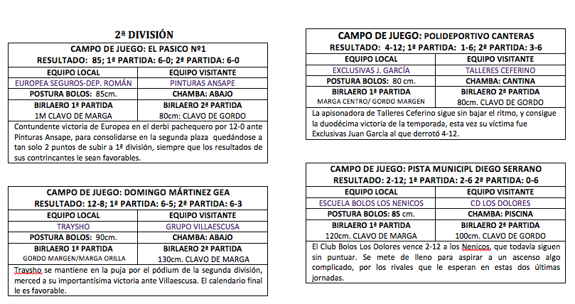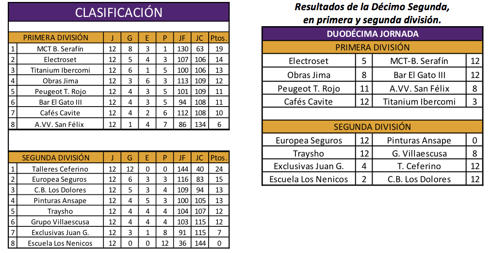 MCT-Bolos Serafín ya ha asegurado el título de primera división del 56 campeonato comarcal a falta de dos jornadas para terminar la liga. Por contra, Asociación de Vecnos San Félix consuma el descenso a segunda división, categoría en la que Europea Seguros se perfila como compañero de Talleres Ceferino en el salto de categoría. Entre los equipos que luchará por la tercera plaza del podio está Ansape, conjunto al que se observa en la foto adjunta.