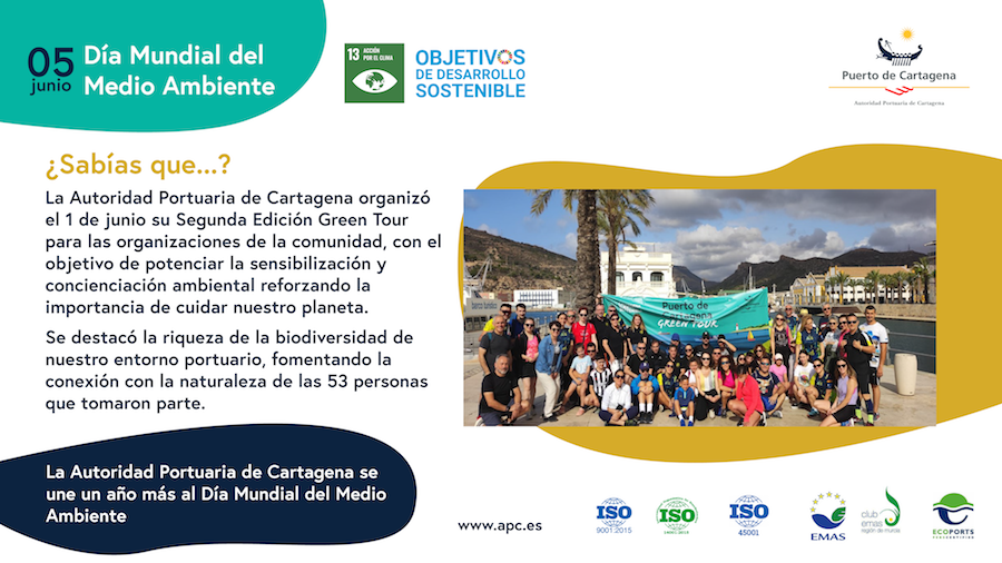Desde 1973 se celebra el 'Día mundial del medio ambiente' en coordinación con el Programa de las Naciones Unidas para el Medio Ambiente (PNUMA) y en este sentido, la Autoridad Portuaria trabaja todo el año por conservar y mejorar su entorno, siendo parte activa de la #GeneraciónRestauración que impulsa Naciones Unidas. Esta gestión ambiental impacta directamente en la protección de los ecosistemas marinos y en la conservación del estado general de nuestro entorno natural terrestre y marino. Además, organiza actividad para resaltar el mensaje de este día, como ha sido una ruta senderista.