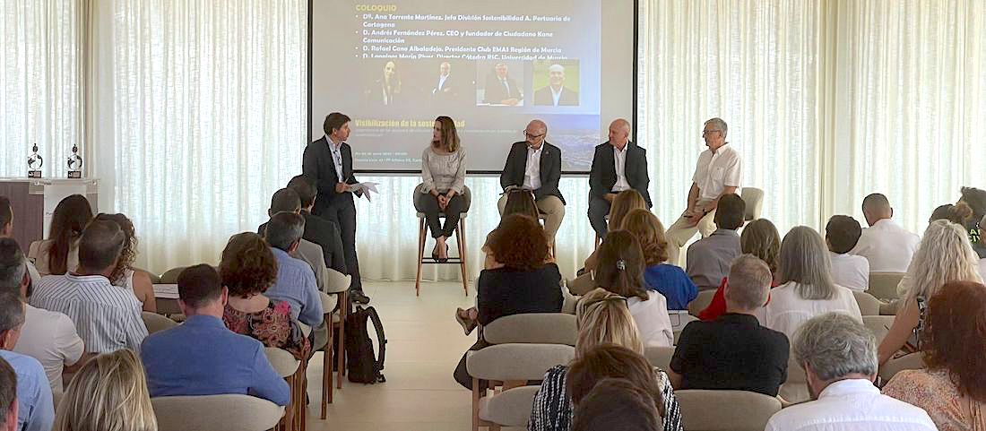Seguidamente, se ha realizado un coloquio donde han participado Ana Torrente Martínez, jefa División Sostenibilidad Autoridad Portuaria de Cartagena; Andrés Fernández, CEO y fundador de Ciudadano Kane Comunicación; Rafael Cano, presidente Club EMAS Región de Murcia; y Longinos Marín Rives, director Cátedra RSC. Universidad de Murcia.