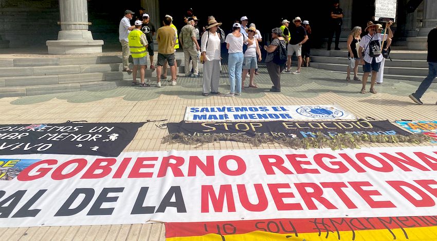 Representantes de organizaciones sociales, vecinales y ecologistas han estado esta mañana ante la fachada de la Asamblea Regional para mostrar su rechazo a la modificación de la Ley 3/2020 de Recuperación y Protección del Mar Menor, promovida por PP y VOX, la cual se está debatiendo en el interior del parlamento regional.