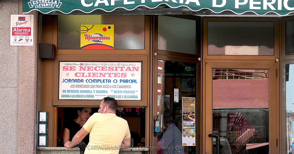Es el llamativo e imaginativo cartel de la cafetería 'D'Perico' de la avenida de Pintor Portela de Cartagena. Se ofrece comida y bebida a 'buen precio'. Los interesados puede elegir 'jornada completa o parcial'. Es imprescindible pedir algún producto para consumir a los camareros.