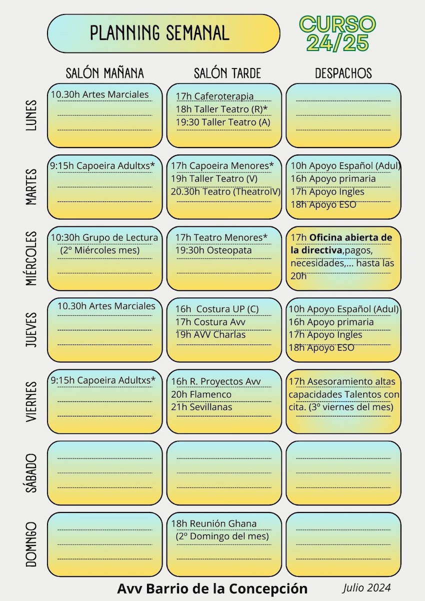 Las actividades programadas por la asociación de vecinos en las que se pueden apuntar los asociados van desde artes marciales hasta bailes de diversos estilos, apoyo en idiomas o ESO, taller de teatro, grupo de lectura, etc. Además, este jueves hay mercadillo de segunda mano. Al margen, ya está expuesto el nuevo Plan General de Ordenación Urbana (PGOU) del municipio, que será analizado mediante mesas de trabajo.