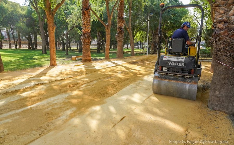 El espacio natural ubicado junto al estadio Cartagonova reabrirá este fin de semana con nuevos bancos, itinerarios más anchos y la recuperación de una zona de juegos infantiles. El servicio municipal de Parques y Jardines ha estado trabajando durante las últimas dos semanas en estas labores de mantenimiento del parque 'Antonio Vallejo'.