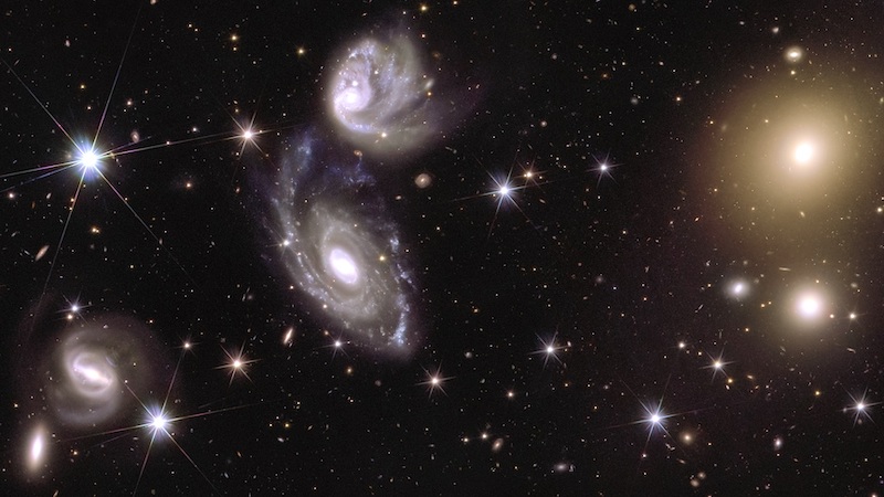 Las observaciones del telescopio en órbita de la Agencia Espacial Europea permiten estudiar la materia y energía oscura del universo. A la izquierda de la imagen adjunta, Euclid captó dos galaxias (llamadas 'ESO 364-G035' y 'G036') que están interactuando entre sí, a 420 millones de años luz de nosotros. A la derecha de la imagen, es visible el cúmulo de galaxias 'Abell 3381', a 678 millones de años luz.