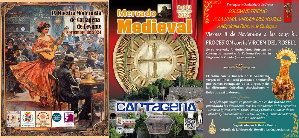 Curiosa imagen que bien se puede ver este fin de semana en el casco histórico, pues Cartagena viajará al pasado, pues en ese área confluirán el tramo final del programa de la 'IX Muestra modernista', las tres jornadas del 'Mercado medieval' y los actos en honor a la Virgen del Rosell, cuya advocación surgen sobre el siglo XIII y que saldrá en procesión el viernes.