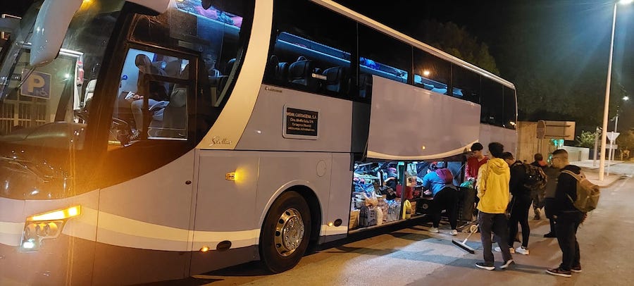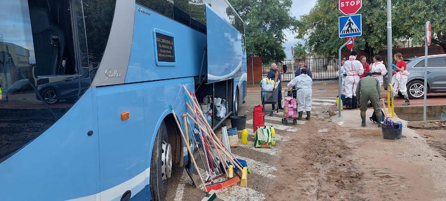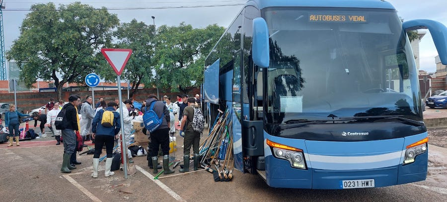 Las fotos corresponden al vehículos de Autocares Vidal, que desplazó, además de utensilios de trabajo y productos de primera necesidad, a voluntarios del personal de la empresa y allegados para trabajar en labores de recuperación en Algemesí (Valencia).