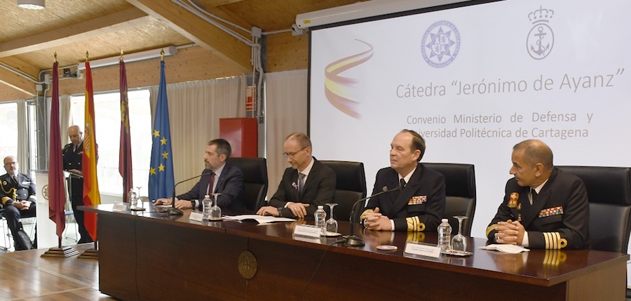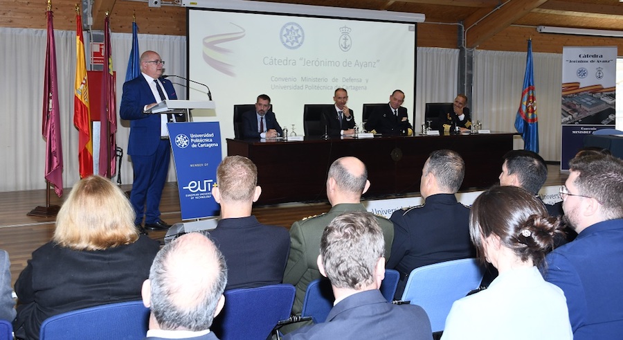 La cátedra ha sido presentada este mediodía en el salón de actos Isaac Peral del antiguo Centro de Instrucción de Marinería (CIM) de Cartagena por el rector de la UPCT, Mathieu Kessler, y el almirante de Acción Marítima, Victoriano Gilabert, en un acto al que también ha asistido el consejero de Universidades, Juan María Vázquez, así como numerosas autoridades militares, civiles y académicas.