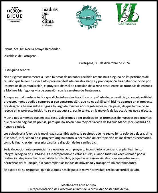 “Mucho nos tememos que esto se convierta en otra autovía interurbana perdiéndose la oportunidad de conectar, mediante carril bici seguro, los barrios de la zona oeste con el casco urbano de Cartagena. Es un ejemplo más del poco compromiso del gobierno de la Comunidad Autónoma con la bicicleta y de la prepotencia municipal, que no vela por los intereses de sostenibilidad en su municipio; y que utiliza los órganos de participación ciudadana, como la Mesa de la Movilidad, como mero órgano informativo, en vez de crear un foro de trabajo y participación verdaderamente consultivo y democrático, donde los usuarios de la bicicleta, peatones y personas de movilidad reducida, podamos expresar nuestras ideas e inquietudes, basadas en nuestra experiencia diaria, al desplazarnos utilizando estos medios de transporte alternativo”, explica José Ángel Vivancos Román de la asociación Vía Libre.