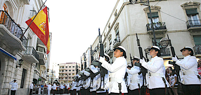 A las 21:15 horas, la Fuerza que rinde honores y la Unidad de Música del Tercio de Levante saldrán desfilando por la puerta del Arsenal de Cartagena y se dirigirán al Palacio de Capitanía General, por la calle Villamartin, mientras se interpretan distintas marchas militares. A la finalización del arriado la Fuerza se retirará desfilando hacia el Arsenal.