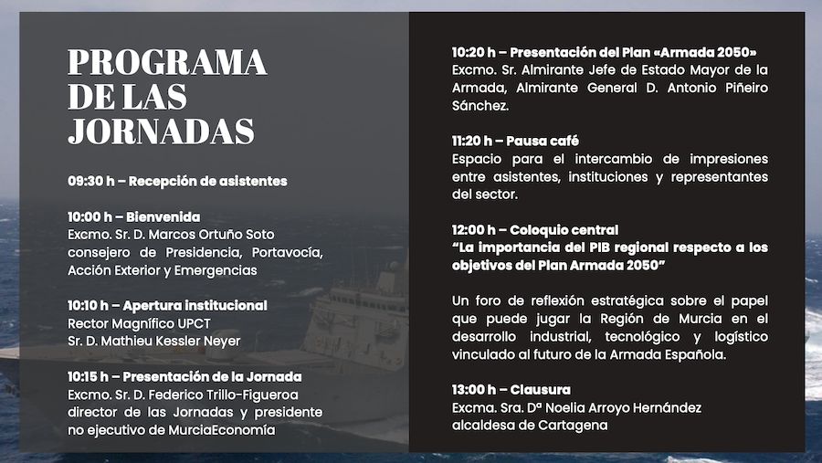 A continuación, tendrá lugar el debate La importancia del PIB regional respecto a los objetivos del Plan «Armada 2050», que reunirá a perfiles vinculados a la estrategia militar, la innovación tecnológica y la industria. Participarán el almirante jefe del Arsenal de Cartagena, Alejandro Cuerda; el director de desarrollo de negocio de SAES, Ignacio Gutiérrez; y el presidente de la Asociación para el Fomento de la Cultura de Seguridad y Defensa, Carlos R. Fernández, en un coloquio moderado por el presidente no ejecutivo de MurciaEconomía, Federico Trillo-Figueroa.