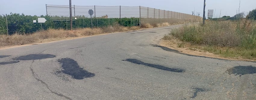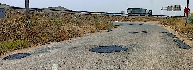 La Comunidad de Regantes del Campo de Cartagena está llevando a cabo la colocación de asfalto en bastantes de los muchos baches que se han originado en los últimos meses en estos caminos situados junto a explotaciones agrarias de uso exclusivamente agrícola en teoría, pues en la práctica son utilizados por numerosos conductores para acortar distancias.