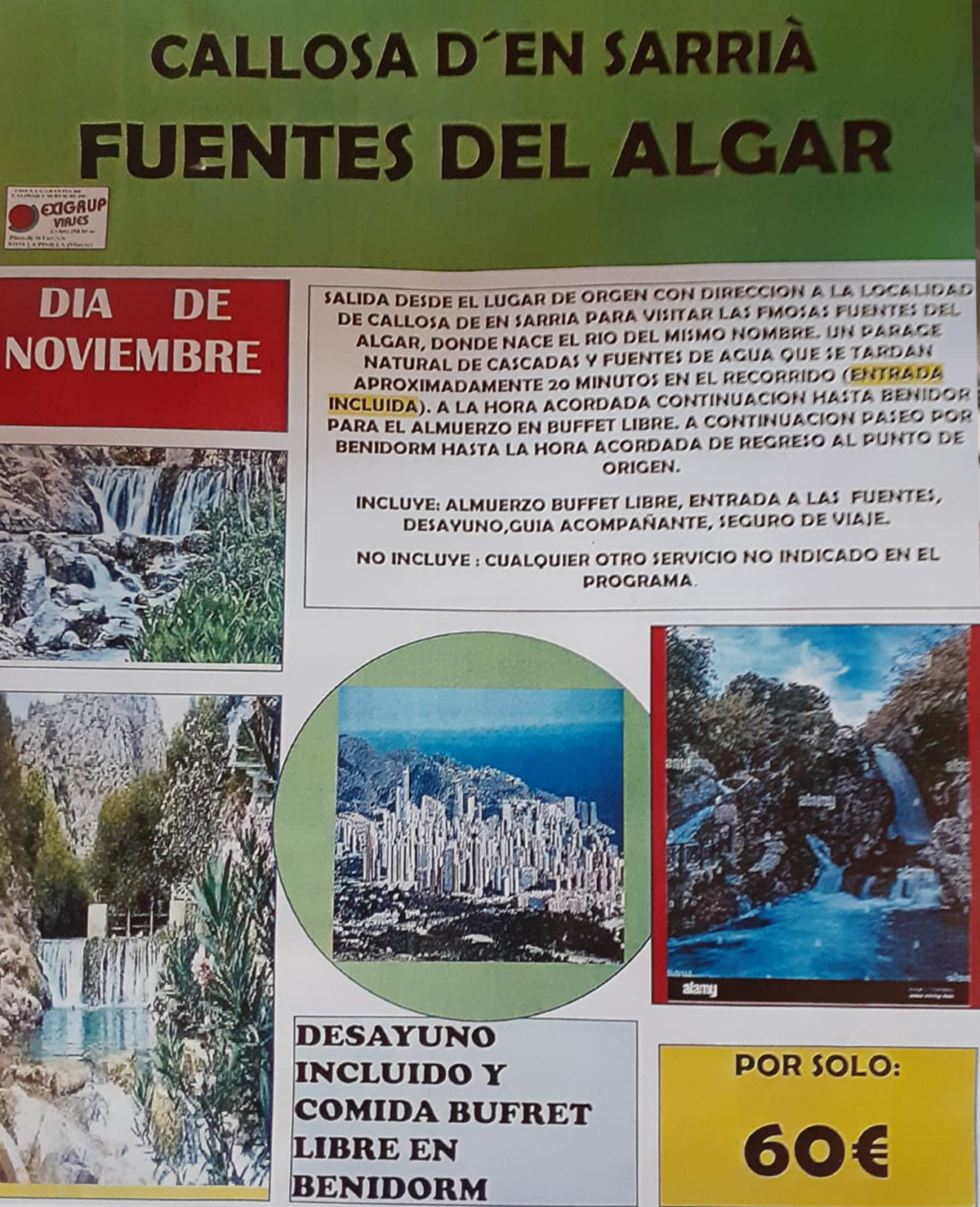 La Asociación de Vecinos de Los Dolores informa de un viaje a las ‘Fuentes del algar’, en Callosa de Sarriá (Alicante), para el próximo 3 de noviembre a un precio de 60 euros por viajero. Incluye el desplazamiento y la entrada a las famosas cascadas naturales y, entre otros, almuerzo con bufé libre en Benidorm.