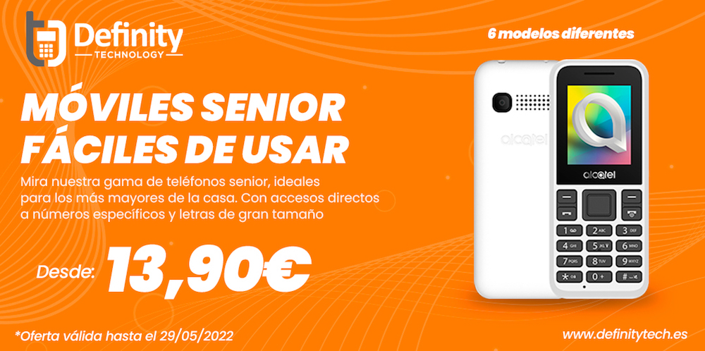 La gama de teléfonos sénior de Definity Technology con ideales para los más mayores de la casa. Tienen accesos directos a números específicos y letras de gran tamaño… Sólo es pequeño su precio. Oferta válida hasta el próximo domingo, 29 de mayo.