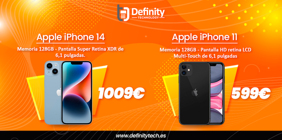 La oferta de esta semana de Definity Technology son dos terminales con 128GB de memoria. El modelo Apple iPhone 14, con pantalla súper retina XDR de 6,1 pulgadas, cuesta sólo 1.009 euros. Por su parte, Apple iPhone 11, con pantalla HD retina LCD y Multi-Touch de 6,1 pulgadas, vale 599 euros. Recuerda que estamos en la calle Mayor de La Unión y en www.definitytech.es