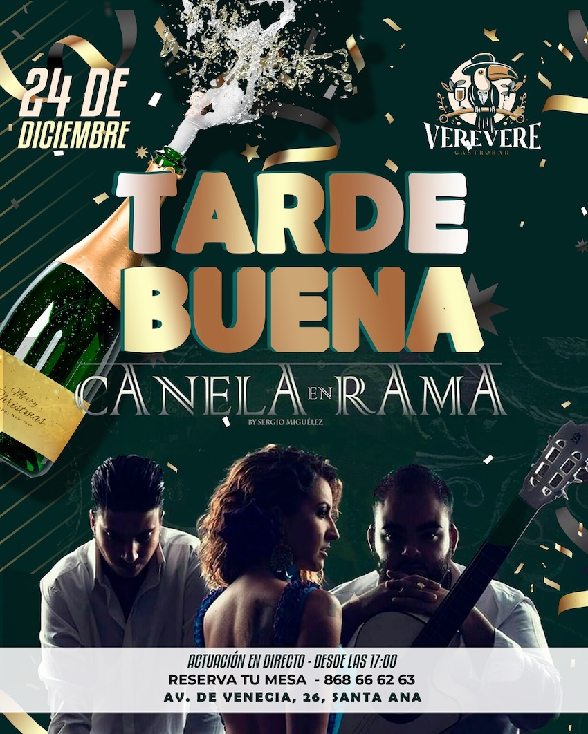 ¡Esta Tardebuena, tenemos el placer de anunciar una tarde mágica en Verevere! A partir de las 17 horas del 24 de diciembre, disfruta de la actuación especial de 'Canela en rama'. Ven a celebrar con buena música, excelente ambiente y la mejor compañía.