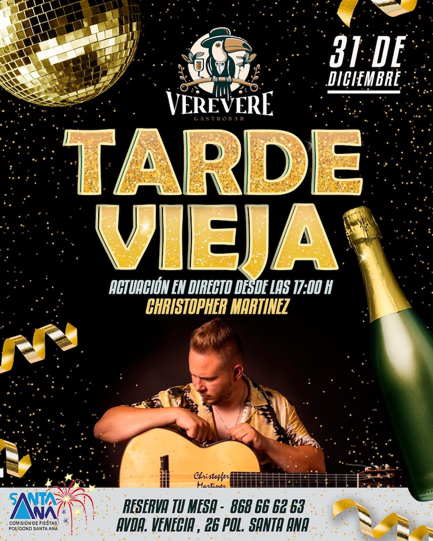 Este 31 de diciembre, celebra con nosotros la Tardevieja en Verevere. Desde las 17 horas, disfruta de la mágica actuación en directo de Christopher Martínez y su banda. Reserva tu mesa ahora y prepárate para despedir el año con buen rollo, música y una experiencia única. Teléfono 868 666 263. ¡Que no te lo cuenten, haz tu reserva ya!