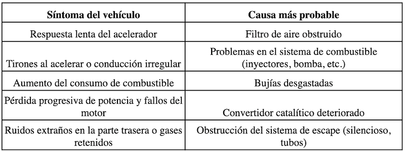 Interpretación de datos diagnósticos: La tabla anterior muestra la correlación directa entre síntomas observables y causas técnicas de pérdida de potencia del motor. Las estadísticas revelan que la respuesta lenta del acelerador está asociada más frecuentemente con el filtro de aire obstruido, afectando aproximadamente al 40% de los casos reportados. Los tirones al acelerar y la conducción irregular indican en el 85% de situaciones problemas en el sistema de combustible, incluyendo inyectores defectuosos o bomba de combustible desgastada.