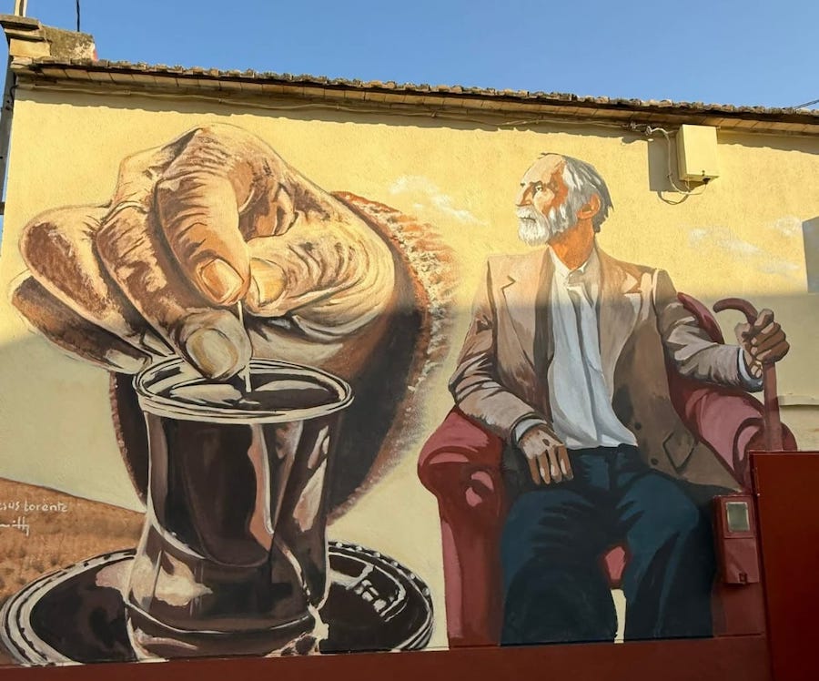 La mano que gira la cuchara en la taza de café muestra una piel curtida por los años y representa, con su giro, el movimiento del paso del tiempo como las vueltas de la tierra alrededor del sol por cada año vivido.