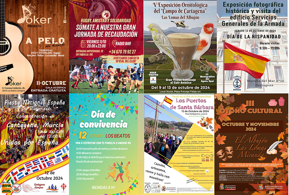 El rugby tiene hoy su fiesta de recaudación, mientras que en La Lomas del Albujón tiene lugar hasta el domingo la exposición ornitológica 'Campo de Cartagena'. En la Muralla del Mar hay una exhibición de fotografía histórica con visita al edificio de Servicios Generales de la Armada. Será el 12 de octubre, sábado, día con fiestas en Barriada de Hispanoamérica, Los Puertos de Santa Bárbara y Los Beatos. También hay actividades en el 'III Otoño cultural' de los pueblos de Cartagena Norte. Otras propuestas son el concierto de esta noche en Joker con entrada gratuita y la concentración del domingo en la plaza del CIM.