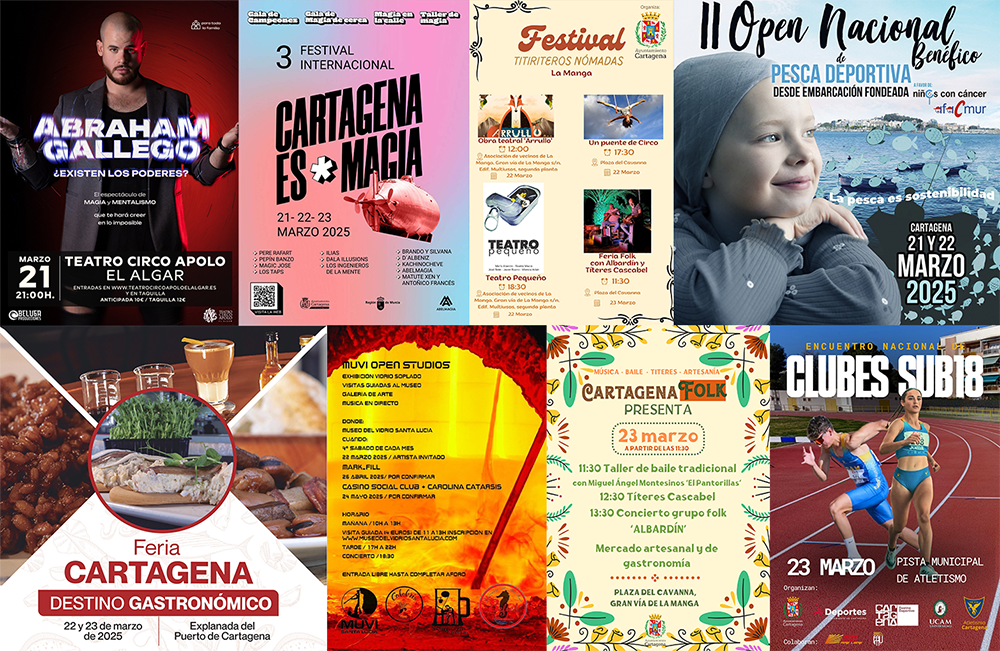 El festival 'Cartagena es magia' llena de prouestas todas las jornadas en varios escenarios, mientras que en la plaza Juan XXIII estará la feria de mayores. También hay open benéfico de pesca deportiva en la dársena, festival titiritero y festival folk en La Manga, visita guiada con espectáculo musical al Museo del Vidrio de Santa Lucía, feria gastronómica en el puerto, ciclo de música religiosa en el Polígono Santa Ana, en Los Dolores y en Los Barreros, recital poético en El Luzzy, y, entre otras, dos espectáculos en el teatro Apolo de El Algar y deportes con voleibol y atletismo.