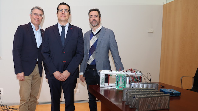 La tesis de Rafael Martínez Sánchez en la UPCT plantea una nueva forma de alargar la vida de las baterías de los vehículos eléctricos o híbridos mediante su regeneración, para que puedan volver a ser usadas, sin necesidad de su destrucción o transformación, en otras aplicaciones como la de almacenamiento de energía renovable en edificios. Foto del autor de la tesis y sus directores junto a parte del sistema que han desarrollado