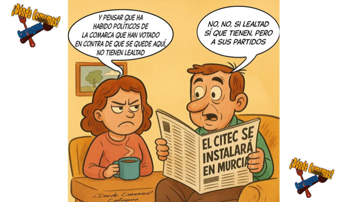 La Asamblea Regional ha aprobado la moción del PSOE para que el 'Citec (Centro de Innovación Tecnológica en Espacio Cognitivo y Ciberdefensa) Caetra' se ubique en la comarca de Cartagena, con el voto en contra del Partido Popular. Esta noticia permite a Enrique Costa y Aida Belmonte, del portal '¿Dónde comemos?, Cartagena', ofrecer una nueva viñeta.