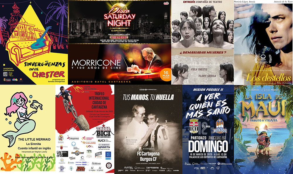 Feria de las inclusiones, varios conciertos, cine en El Luzzy y en La Puebla, cuatro propuestas en El Batel, dos en el Apolo de El Algar, espectáculo de ciencia en El Albujón, micro abierto en Las Lomas de Canteras, exposiciones y, entre otras, las que afectan al deporte, como el trofeo internacional de trialbici en Los Camachos y los partidos frente a equipos de Burgos del FC Cartagena y del Odilo Cartagena CB.
