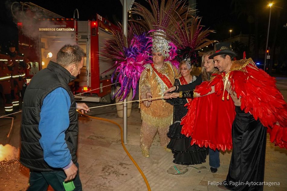 La falla que representa a la figura principal masculina del Carnaval de Cartagena fue quemada anoche en el puerto en unas anómalas fechas, pues salvo error u omisión (s.e.u.o.) no recordamos otra edición desde 1980 que fuera devorado por las ramas en tiempo procesionista, siendo el motivo en esta ocasión las lluvias, que obligaron a retrasar la fecha fijada en un principio. La noche culminó con el castillo de fuegos artificiales.