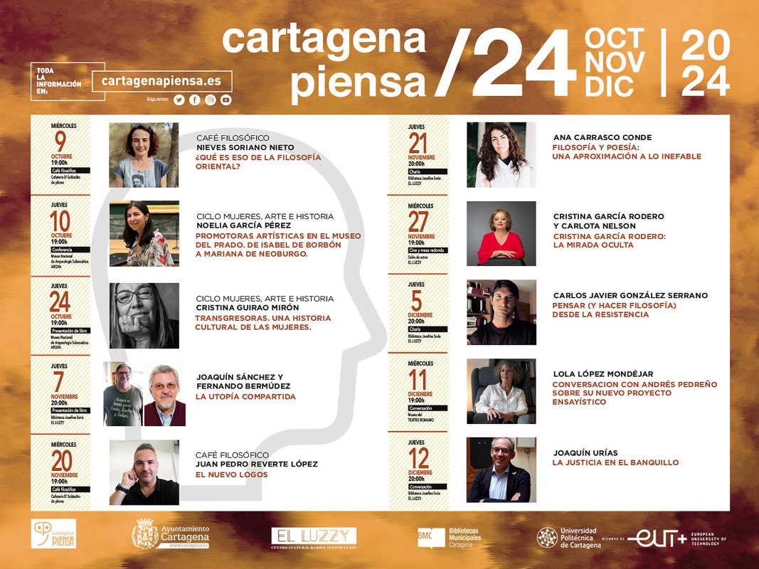 En esta nueva edición trimestral del programa de pensamiento y cultura científica Cartagena Piensa, que hace la número 24 desde su creación en 2016, se abordan distintas cuestiones que tienen que ver con temas de gran interés como son el papel de las mujeres en la cultura y el arte, la necesidad de la utopía, los efectos de la digitalización sobre la individualidad contemporánea, la resistencia contra la manipulación intelectual y el totalitarismo emocional, las relaciones entre filosofía y poesía, la cuestionada imparcialidad de la justicia, la figura y el trabajo de Cristina García Rodero, cómo pensar en el siglo XXI, o qué es la filosofía oriental, entre otros.