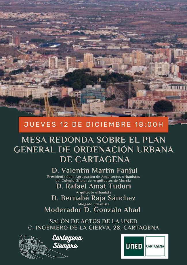 La asociación 'Cartagena siempre' organiza un debate con expertos sobre el nuevo Plan General de Ordenación Urbana para la tarde de este jueves, en la sede de la UNED, con la finalidad de tratar con rigurosidad el profundo impacto que va a tener esta normativa urbanística para el futuro del municipio.