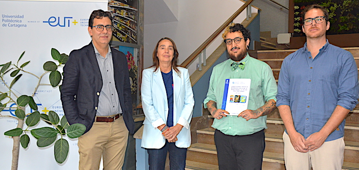 La tesis de Diego Hernández, con aplicación de Inteligencia Artificial, halla diferente biodisponibilidad entre hombres y mujeres de compuestos antioxidantes. En la foto se le observa con la tesis en las manos junto alos investigadores que la han dirigido