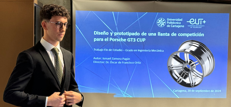 La pasión por la competición automovilística ha llevado al estudiante Ismael Zamora Pagán a concluir el grado en Ingeniería Mecánica por la UPCT con un trabajo final de diseño y prototipado de una llanta para el Porsche de competición GT3 CUP.