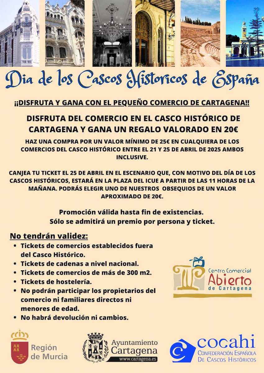 Las tiendas del caco histórico de Cartagena reparten regalos por comprar del 21 al 25 de abril. La iniciativa forma parte de la conmemoración del Día de los Cascos Históricos de España.
