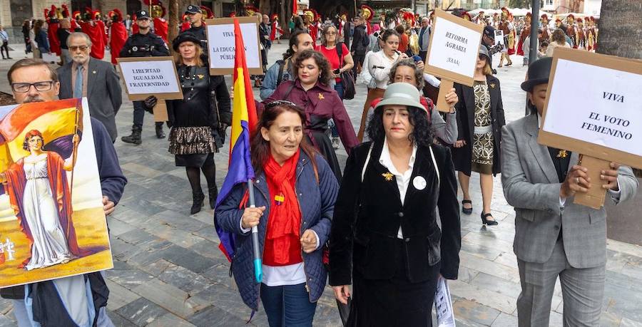 Ha tomado el relevo de Bernardo Sánchez, nativo de Los Dolores al igual que ella, en el colectivo cartagenero que defiende los principios de la II República española desde 2009. En la foto se la observa en el centro, con sombrero, en la recreación reciente de cuando el 14 de abril de 1931 se alzó la bandera republicana en Cartagena.