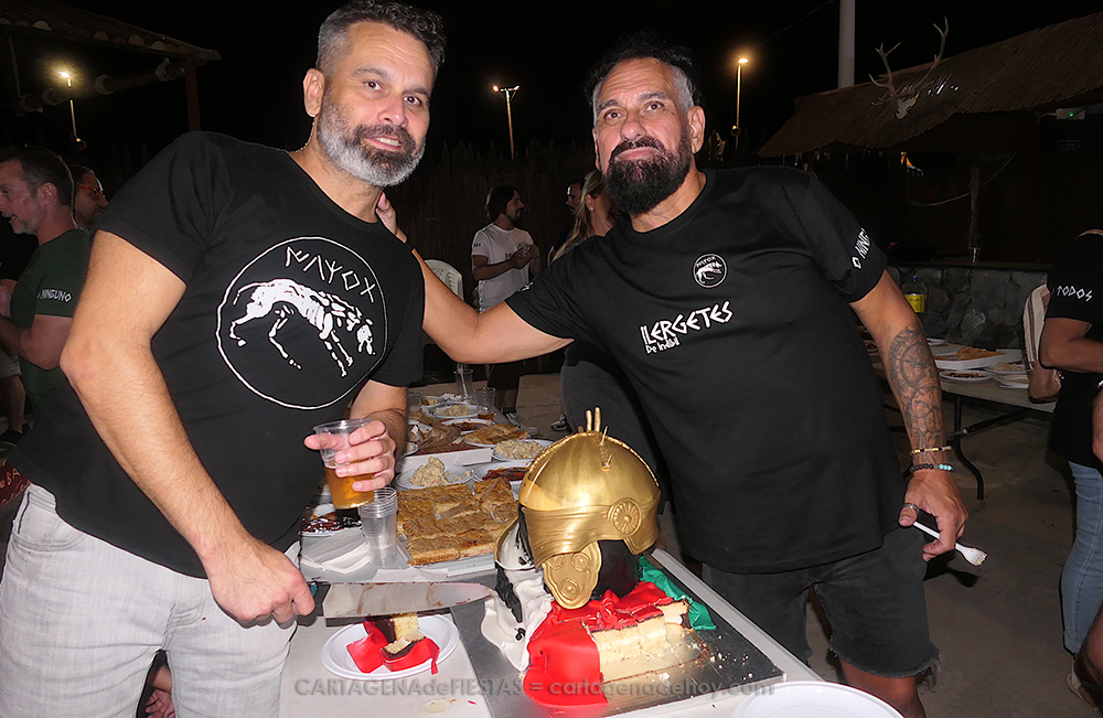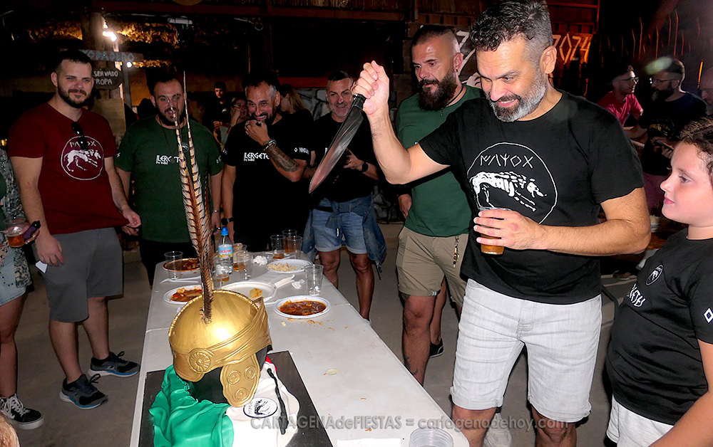 Jorge Preciado Vera, de Ilergetes de Indíbil de las históricas fiestas cartageneras, se encontró anoche, en la aldea del grupo en el campamento, con la gran sorpresa de una tarta con forma del tradicional casco con cinco plumas de la tropa.