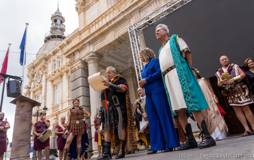 El casco histórico ha vuelto a ser el escenario del recorrido del grupo de veteranos festeros que cada año da a conocer en la mañaña del primer día de Carthagineses y Romanos el programa de los diez días y que este año ha tenido más acompañantes vestidos de época que en otras ediciones. No han faltado las ‘puntillas’ por el tema ferroviario o la degradación de las estaciones de tren y de autobuses, entre otros temas.