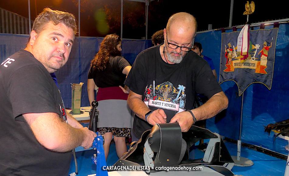 Debido a esto último, este año los integrantes de la legión han acometido la elaboración de siete corazas de forma artesanal, como ha hecho siempre el grupo. José Luis Navarro, uno de sus componentes, explica a este periódico que el proceso comienza con el corte del cuero, el cual se sumerge después en el agua y luego se deja tres días en el molde, culminando con el montaje de adornos y remaches, labor en la que los legionarios estaban inmersos, contrarreloj, en la noche del jueves, en el preludio festero del campamento, pues por sus diversas ocupaciones no habían podido terminarlas antes.