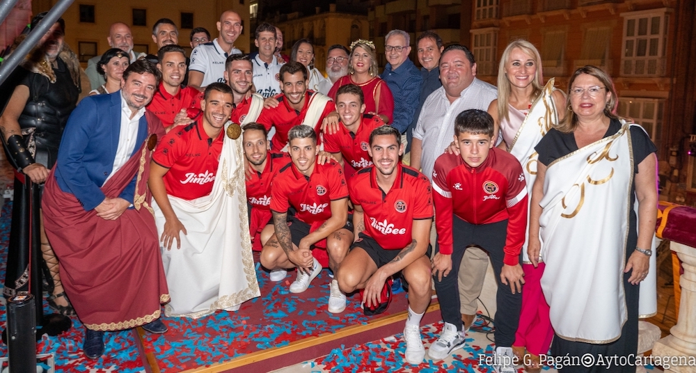 Cartagena revive hasta el 29 de septiembre su historia milenaria con la gran fiesta del Mediterráneo: Carthagineses y Romanos. Así lo han anunciado los jugadores del Jimbee Cartagena de fútbol sala en el pregón que han ofrecido en la plaza del Ayuntamiento este viernes, 20 de septiembre. Esta primera jornada ha sido la más deportiva que se recuerda, puesto que en el acto de encendido del fuego sagrado que ha tenido lugar en el cerro del Molinete han sido protagonistas los futbolistas Toché y Gonzalo Verdú. Además, la Federación de Tropas y Legiones ha nombrado al club de baloncesto Odilo FC Cartagena CB como festero honoris causa.