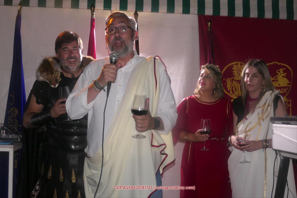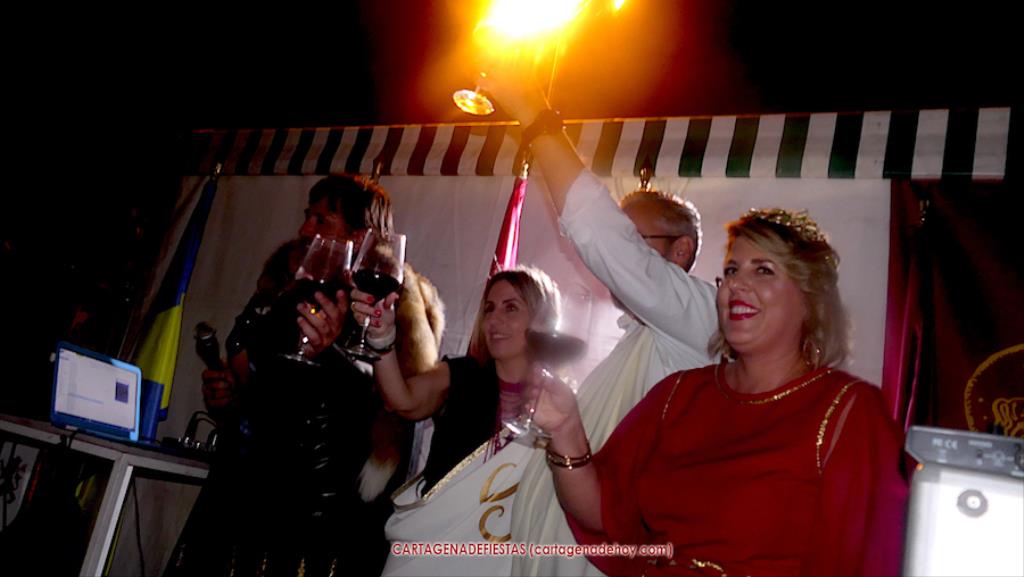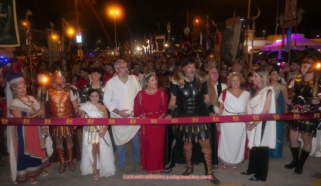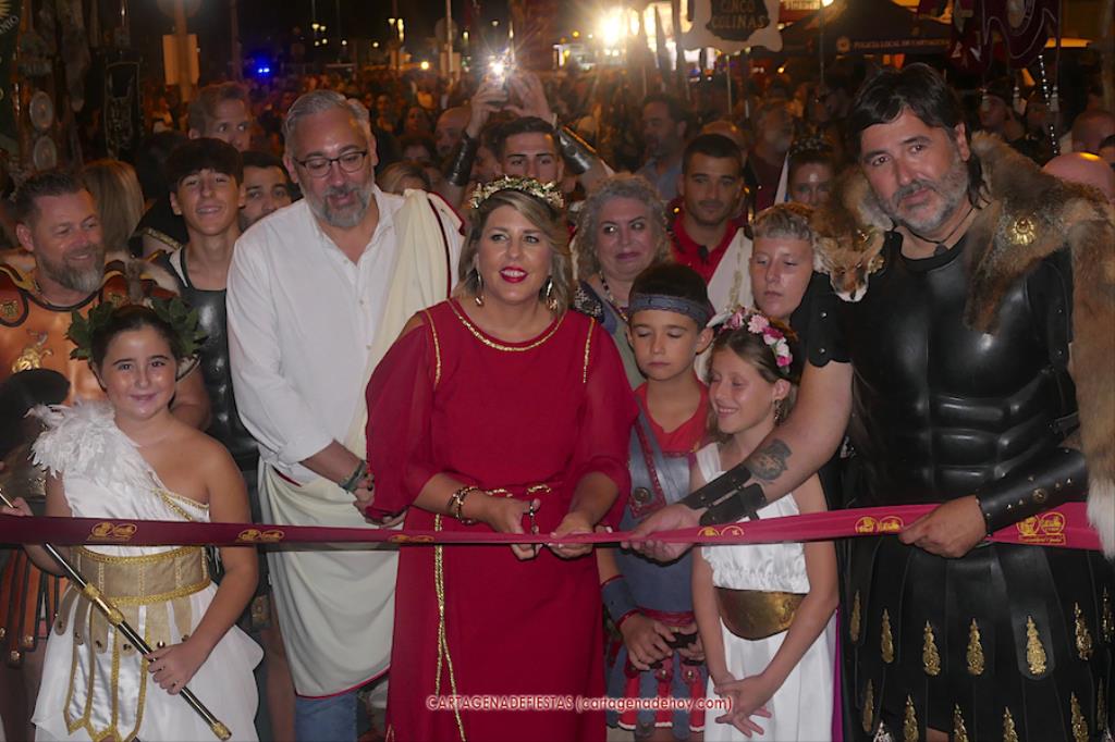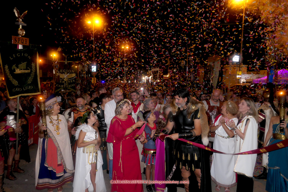 El corte de la cinta lo llevó a cabo la primera autoridad local, Noelia Arroyo, dando los siguientes cortes a la cinta el presidente de la Federación de Tropas y Legiones, José Antonio Meca; el alcalde de Santomera, Víctor Manuel Martínez; y la teniente de alcalde de Linares, Mariola Aranda. El confetti envolvió ese momento, para a continuación explotar en el cielo los fuegos artificiales mientras que la comitiva recorría la calle carthaginesa del campamento con dirección a la zona de protocolo, donde tuvo lugar 'el vino (y tapeo) de honor', en una velada en la que hubo música en directo y en la que se brindó por el buen devenir de las fiestas, resaltando el alcalde santomerano que este año han quedado unidos por el fuego sagrado Cartagena y su tierra.