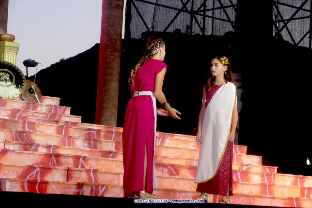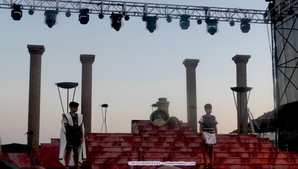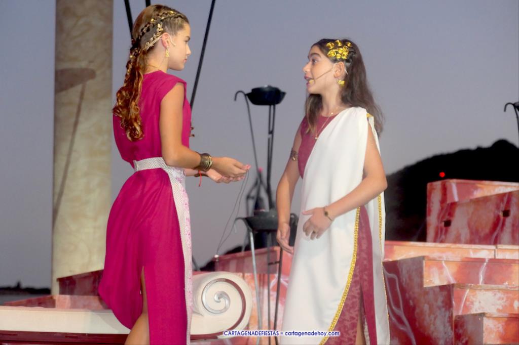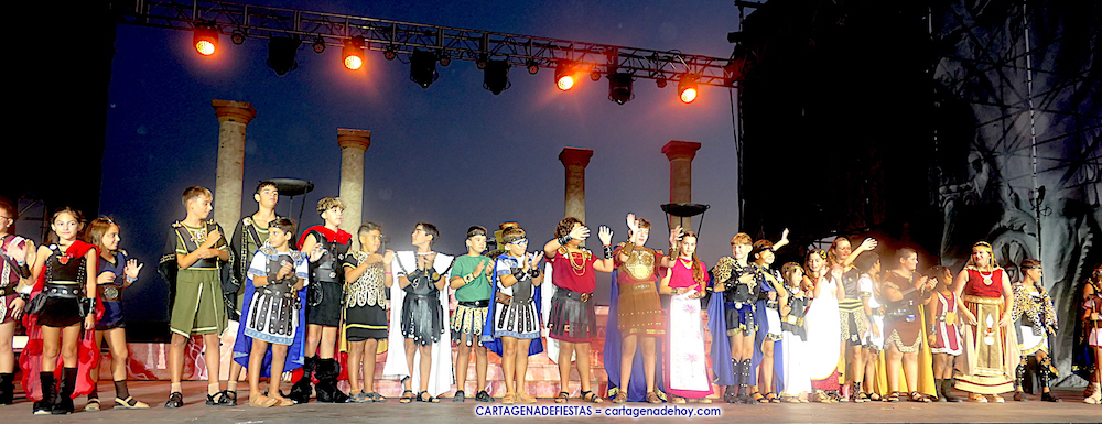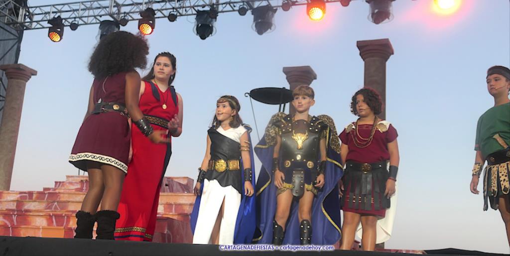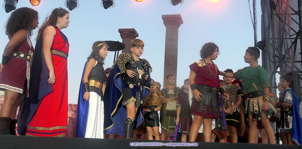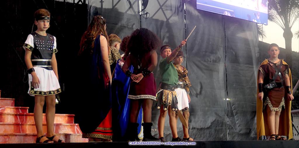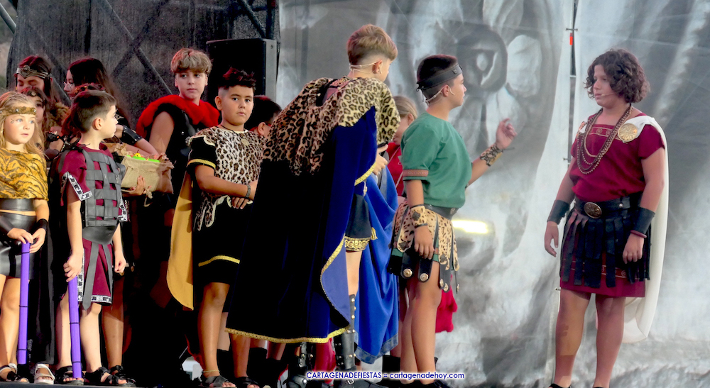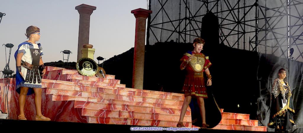 Los personajes infantiles del Consejo Carthaginés cautivaron al público con la puesta en escena de 'Tras las huellas de Cartago' y 'El pacto de Himilce', demostrando que en Carthagineses y Romanos el relevo generacional de los actores festeros está garantizado.
