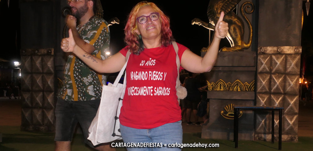 Carolina Pereira Peña ha alcanzado las dos décadas trabajando en la oficina de la Federación de Tropas y Legiones de Carthagineses y Romanos con una gran eficacia, motivo que ha motivado que le hayan confeccionado la camiseta conmemorativa que se observa.